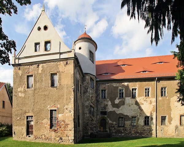 Das Zentrum des Rittergutkomplexes bildet jedoch das in einer Talsenke liegende und früher von einem Wassergraben umgebene Herrenhaus im Renaissancestil. Hans Heinrich von Schönberg baute es in der Mitte des 16. Jahrhunderts. Der Graben ist heute zugeschüttet und nur noch an geringen Absenkungen des Bodens erkennbar. Umbauten im 19. Jahrhundert veränderten das Herrenhaus nochmals. Der rechtwinklige, zweigeschossige und verputzte Bruchsteinbau mit Eckquaderung und Satteldach besteht aus einem längeren und einem kürzeren, nach Süden orientierten Flügel. Die Spitzgiebel mit Doppelgesims und zwei kleinen Rundfenstern im Obergeschoss sowie obelisken Aufsätzen sind eher schlicht gehalten. Am Westgiebel erhielt sich unter dem Hauptgesims ein Putzfeld für eine Sonnenuhr. Im Winkel zwischen den zwei Flügeln steht ein schlanker Treppenturm mit barocker Haube. Seine schrägen Fenster zeigen an, dass in seinem Inneren ein Wendelstein das obere Stockwerk erschließt. Rechts neben dem Turm befindet sich ein durch Muscheln verziertes Sitznischenportal mit reich profiliertem Rundbogen. Darüber ein kleines Flurfenster und das Allianzwappen von Hans Heinrich von Schönberg und seiner Frau Maria von Miltitz, bezeichnet mit "H H v S" und "M v M". Im nordöstlichen Teil schließt sich der rechtwinklige ehemalige Gutshof an. Über der östlich gelegenen Toreinfahrt mit Sandsteinpfeilern zwischen zwei Nebengebäuden weisen ein Wappen und die Buchstaben "A. v. S." sowie die Jahreszahl 1854 auf die Umbauten des Rittergutes im 19. Jahrhundert hin.