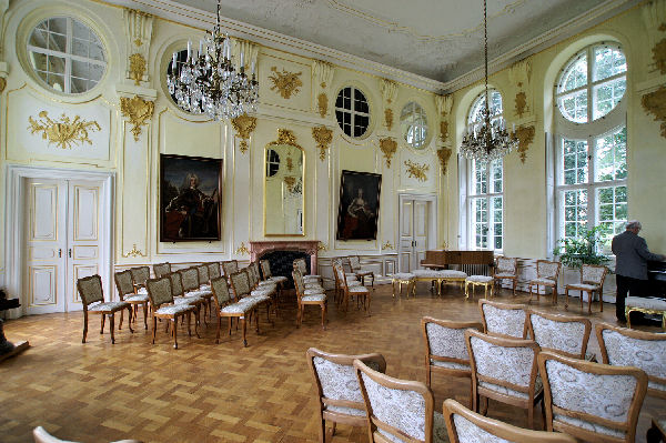 Durch eine ebenerdige Tür betritt man das Vestibül des Hauses. Eine seitlich angeordnete Treppenanlage führt in das obere Stockwerk mit dem Festsaal, dessen Wand- und Deckenverzierungen, Gemälde, Spiegel und Kronleuchter einen besonderen festlichen Glanz ausstrahlt. Hohe bogenförmige Fenster eröffnen den Blick auf den Schlosshof und den Schlosspark.