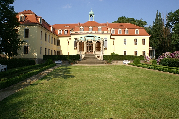 Von der Gartenseite des Schlosses hat der Besucher einen sehr schönen Ausblick auf die abfallende Gartenlandschaft. Vom Gartenpavillon gelangt man über eine Freitreppe in den Schlosspark im Stile einer geometrisch-französischen Anlage des 18. Jahrhunderts. An ihn schließt sich im Knorrgrund ein englischer Landschaftsgarten des 19. Jahrhunderts an.