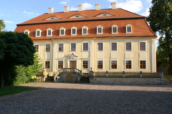 Im 18. Jahrhundert beginnt auch die Geschichte des Herrenhauses. Julius Alexander von Hartitzsch ließ in den Jahren 1753 bis 1756 für sich und seine zweite Ehefrau Magdalena Elisabeth von Zehmen das zweigeschossige Bauwerk errichten. Von einer etwas erhöht gelegenen schmalen Gartenterrasse, auf der das Gebäude steht, konnte der Herr den niedriger gelegenen Rittergutshof überblicken. Der stattliche Bau eines typischen barocken Landschlosses des 18. Jahrhunderts besitzt eine mit 11 Fenstern ausgestattete Front und ein Mansarddach. Die Fenster sind von schlichten Sandsteingewänden umrahmt. Die barocke Architekturgliederung mit hellen Wandspiegeln unter den Fenstern und Wandstreifen am Mittelrisalit sowie an den Hausecken ist aufgemalt. Eine zweiläufige Freitreppe mit kräftigen Steinbrüstungen führt vom Hof zum Podest vor dem Eingangsportal. Das Tor ist hervorgehoben durch ein Gewändeprofil und eine barock geschweifte Verdachung aus Sandstein. Darunter befindet sich das Ehewappen derer von Hartitzsch. Auf grünem Grund ist in goldener Schrift zu lesen: "J. A. V. H. | Anno MDCCLIII | M. E. V. H. G. V. Z.". Im Innern des Hauses empfängt den Besucher eine mit zwei Pfeilern untergliederte Halle. Dahinter erschließt eine dreiteilige Treppen die Räume im Obergeschoss.