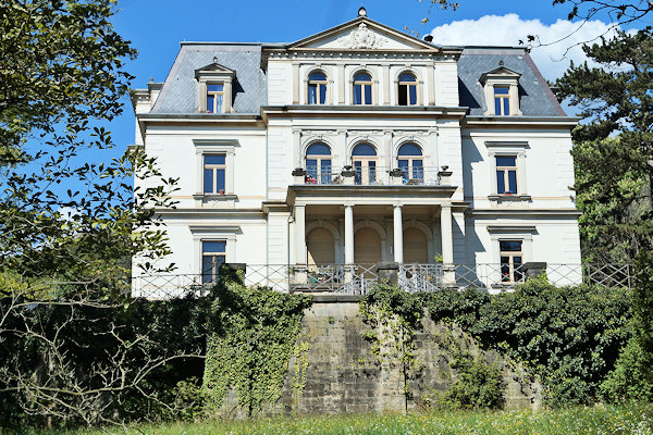 Die symmetrische Dreiflügelanlage wendet sich einem kleinen Ehrenhof mit Rondell und Brunnenanlage zu. In der Mitte des hervortretenden Mitteltrakts führt ein neobarockes Portal mit geschnitzten Holzverzierungen in das Schloss. Von hier betrat man die herrschaftlichen Empfangs- und Gesellschaftsräume mit Speisesaal und Bibliothek im Erdgeschoss. Im Obergeschoss standen mit wertvollen historischen Möbeln und Gemälden ausgestattete Räume für die private Nutzung zur Verfügung. Zur Elbseite breitete sich die großzügige Gartenanlage mit Terrassen, Treppen und Grünflächen im Stil der Zeit aus. Eine kleine Kapelle mit Deckengemälde von Heinrich Bickel und eine Orgel der Firma Jehmlich fügten sich an der Südseite an.