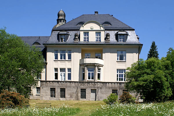 Auf der Hofseite wird der Eingang durch einen dreigeschossigen Turm mit umlaufender Galerie hervorgehoben. Das Portal umrahmen dorische Säulen, Ziervasen und ein Relief. Die Ostseite des Hauses besetzt ein gewölbter Wintergarten. Im Westen gliedert sich an den Hauptbau ein etwas niedriger Seitenflügel an. Ein schiefergedecktes Mansarddach gibt dem Herrenhaus das Aussehen eines Schlosses aus dem 18. Jahrhundert.