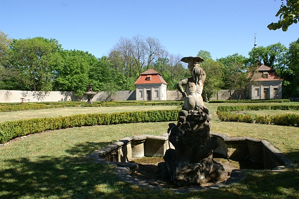 Mit der Zerstörung des Schlosses hat auch der einst mit Wassergräben umgebene Schlosspark seinen Bezugspunkt verloren. Dennoch ist in der gelungenen Anlage französischer Art sehenswerte Substanz erhalten geblieben. In der von August Ferdinand Graf von Pflugk um 1710 angelegten Parkanlage laufen mit niedrigen Hecken gesäumte Wege auf einen schönen Sandsteinbrunnen zu. Auf einem felsartigen Sockel trägt ein mit Voluten, Muscheln, Schilf und Fratzen verzierter Pfeiler ein mit Tannenzapfen verziertes Becken. Darüber sitzen drei Putten, eine Muschel als Becken haltend. Die vier Kreuzungspunkte der Nebenachsen werden durch wasserspeiende Tritonen hervorgehoben. Eingefasst wird die mit geometrischen Wegen und Rasenflächen versehene Anlage durch eine umlaufende Mauer und vier durch Lisenen gegliederte Gartenhäuschen mit Mansarddach. Eines der Häuschen ist als Grottenpavillon mit strukturiertem Grottenraum ausgestattet.
